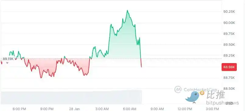 加密资产同样如此。比特币价格在消息公布后,先是从 $89,600 短暂下探至 $89,000 关口,随后迅速拉回至 $89,300 附近。波动幅度不足 1%,以太坊(ETH)徘徊在 $3,000 大关,Solana 和 XRP 等主流山寨币也维持在前期震荡区间。