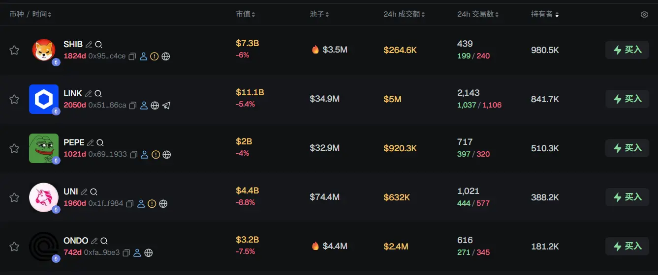 过去 24h ETH 热门代币前五依次为:SHIB、LINK、PEPE、UNI、ONDO