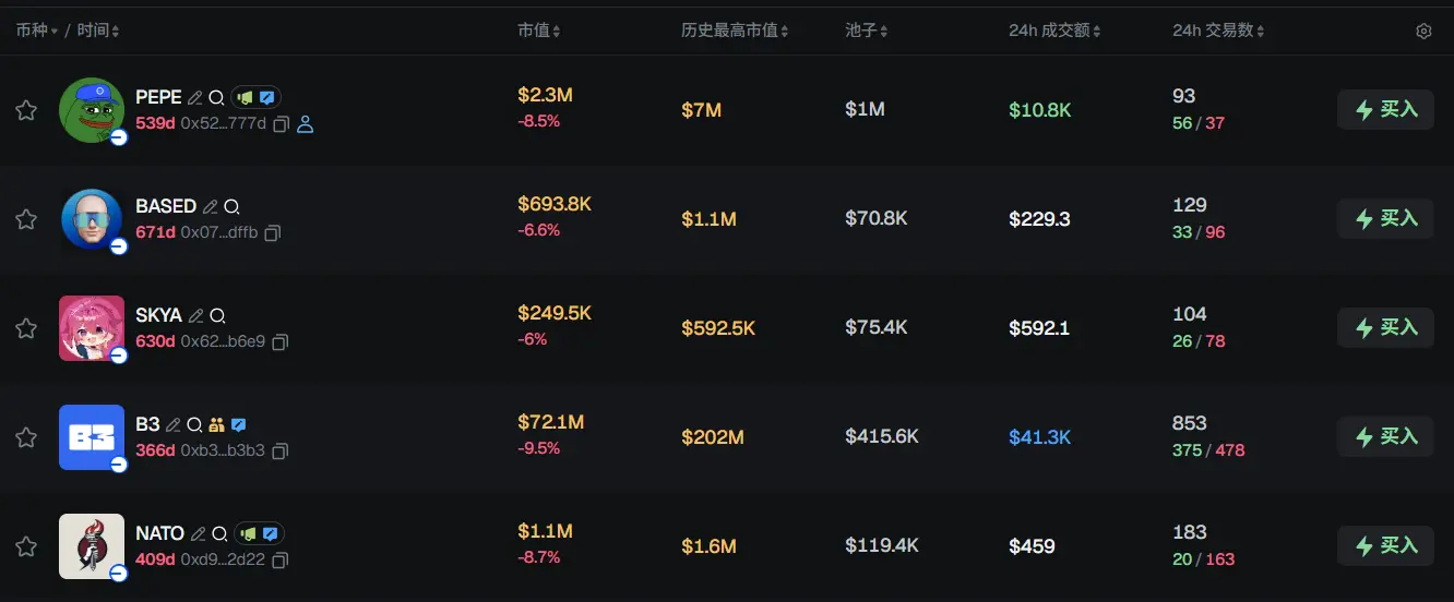 过去 24h Base 热门代币前五依次为:PEPE、BASED、SKYA、B3、NATO