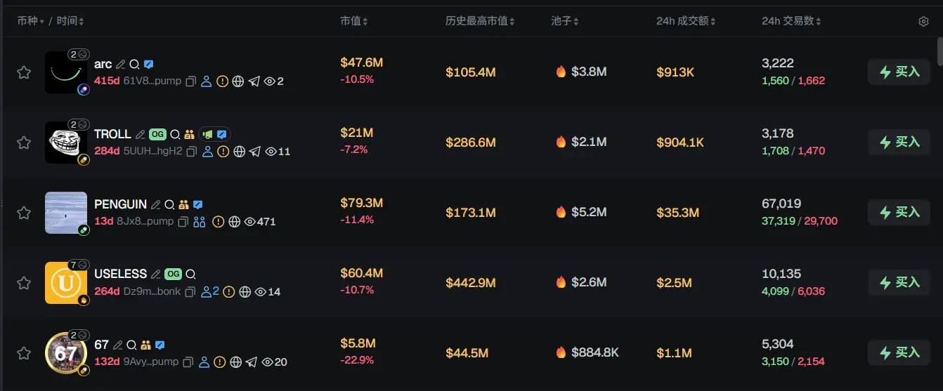 过去 24h Solana 热门代币前五依次为:arc、TROLL、PENGUIN、USELESS、67