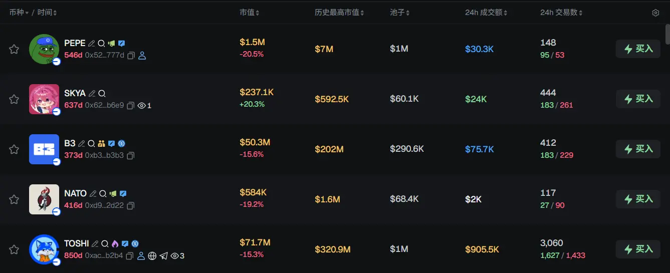 过去 24h Base 热门代币前五依次为:PEPE、SKYA、B3、NATO、TOSHI