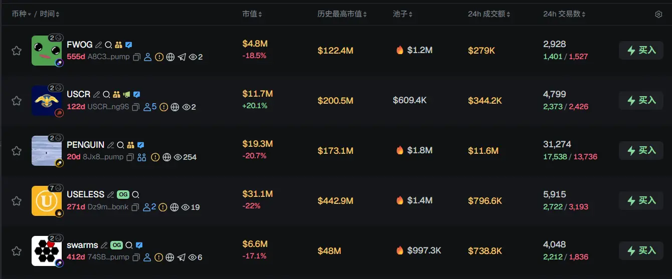 过去 24h Solana 热门代币前五依次为:FWOG、USCR、PENGUIN、USELESS、swarms