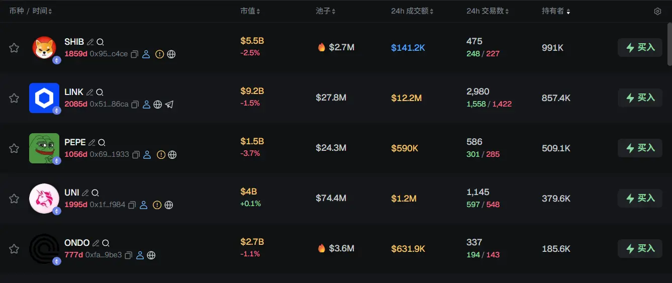 过去 24h ETH 热门代币前五依次为:SHIB、LINK、PEPE、UNI、ONDO