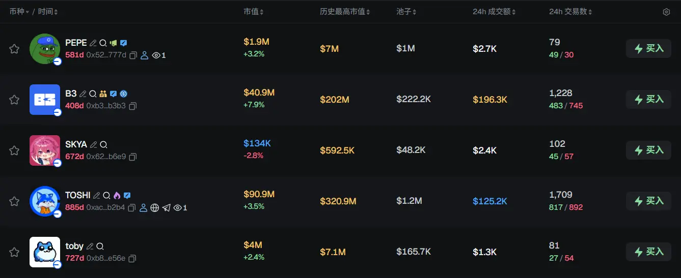 过去 24h Base 热门代币前五依次为:PEPE、B3、SKYA、TOSHI、toby