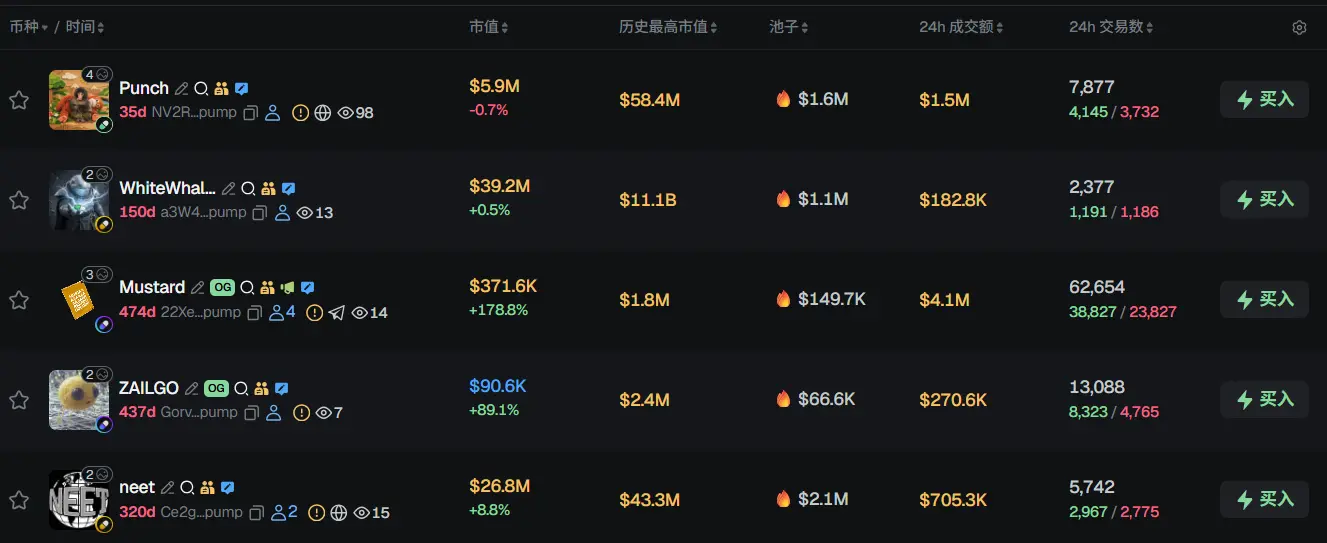 过去 24h Solana 热门代币前五依次为:Punch、WhiteWhale、Mustard、ZAILGO、neet