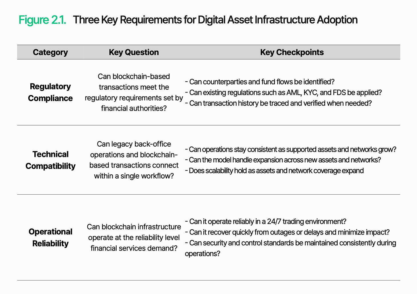 要作为金融基础设施发挥作用,必须在其基础上构建独立的交易处理、管理和控制运营系统。在采用该系统之前,金融机构必须首先评估三个方面:监管合规性、技术兼容性和运行可靠性。