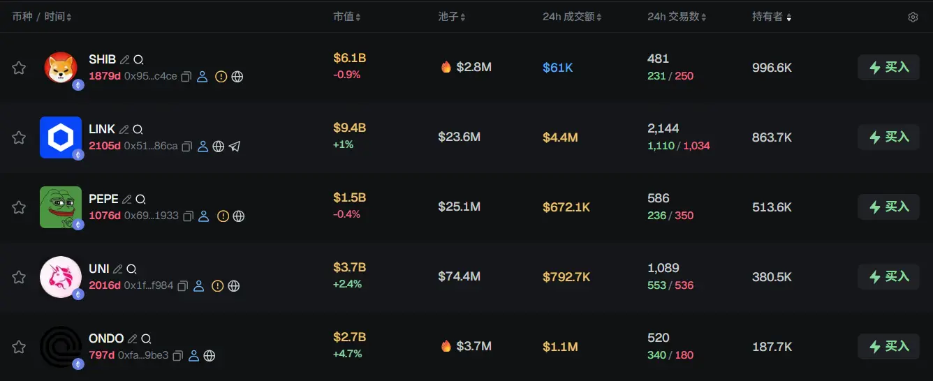 过去 24h ETH 热门代币前五依次为:SHIB、LINK、PEPE、UNI、ONDO