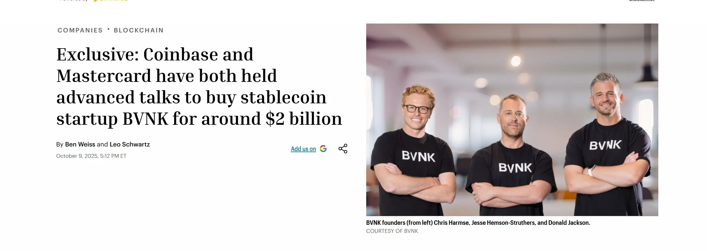 早在这笔收购尘埃落定之前,2025 年 10 月初,Coinbase 就曾率先与 BVNK 展开收购谈判,交易区间锁定在 15 亿至 25 亿美元,综合多方消息来看,Coinbase 在这场竞购中一度占据上风,甚至曾与 BVNK 签署排他性协议。