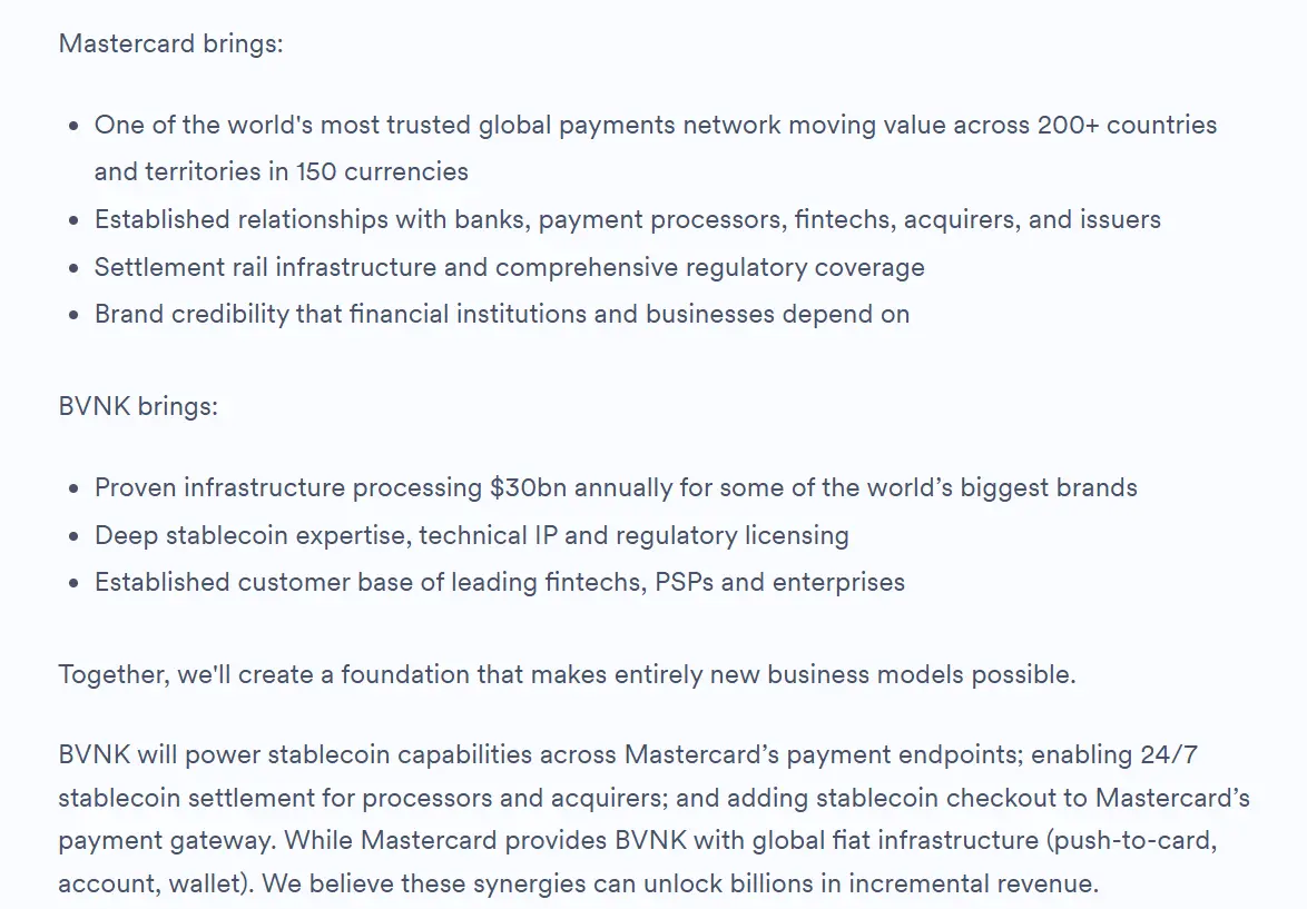 BVNK 在最新官方 Blog 中也明确写到,未来双方的协同方向包括由 BVNK 为 Mastercard 的支付端点提供稳定币能力,为处理商和收单机构实现 24 小时稳定币结算,并将稳定币结账能力纳入 Mastercard 支付网关,并直言这些协同效应有望带来数十亿美元的新增收入。