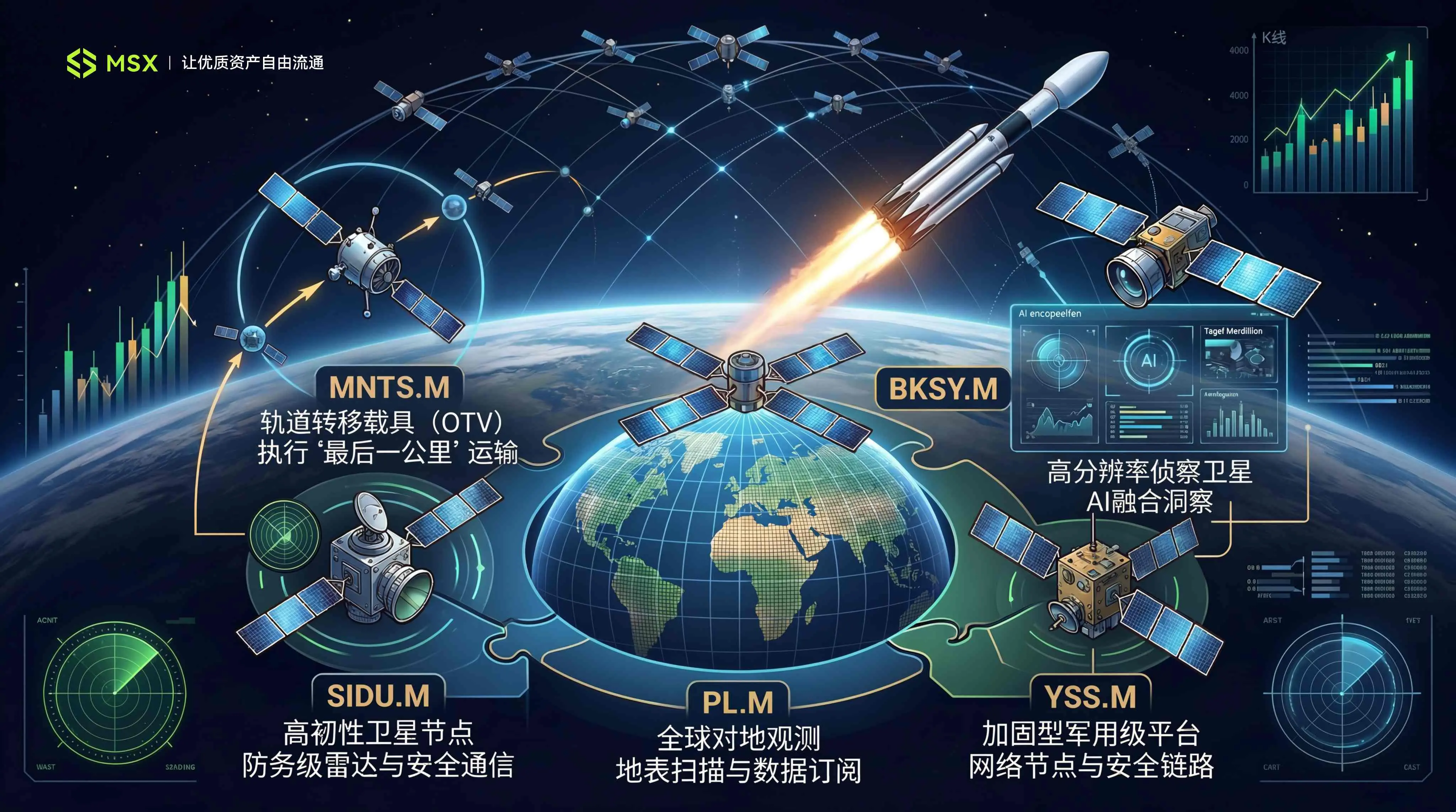 最明显的体现,就是此次 MSX 上新的商业航天「五小龙」MNTS.M、SIDU.M、PL.M、BKSY.M、YSS.M,都有各自扎实的基本面支撑,算得上是对商业航天产业链几个核心方向的一次集中覆盖: