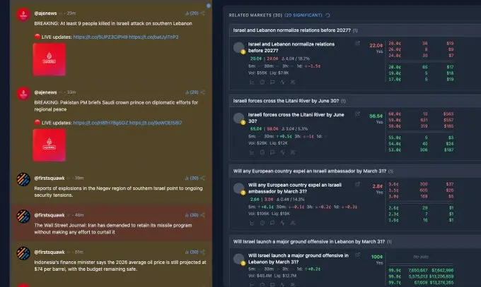 点击任意一条新闻,右侧会自动弹出所有相关市场,直接显示当前价格、流动性、5 分钟/30 分钟/3 小时的价格变动。