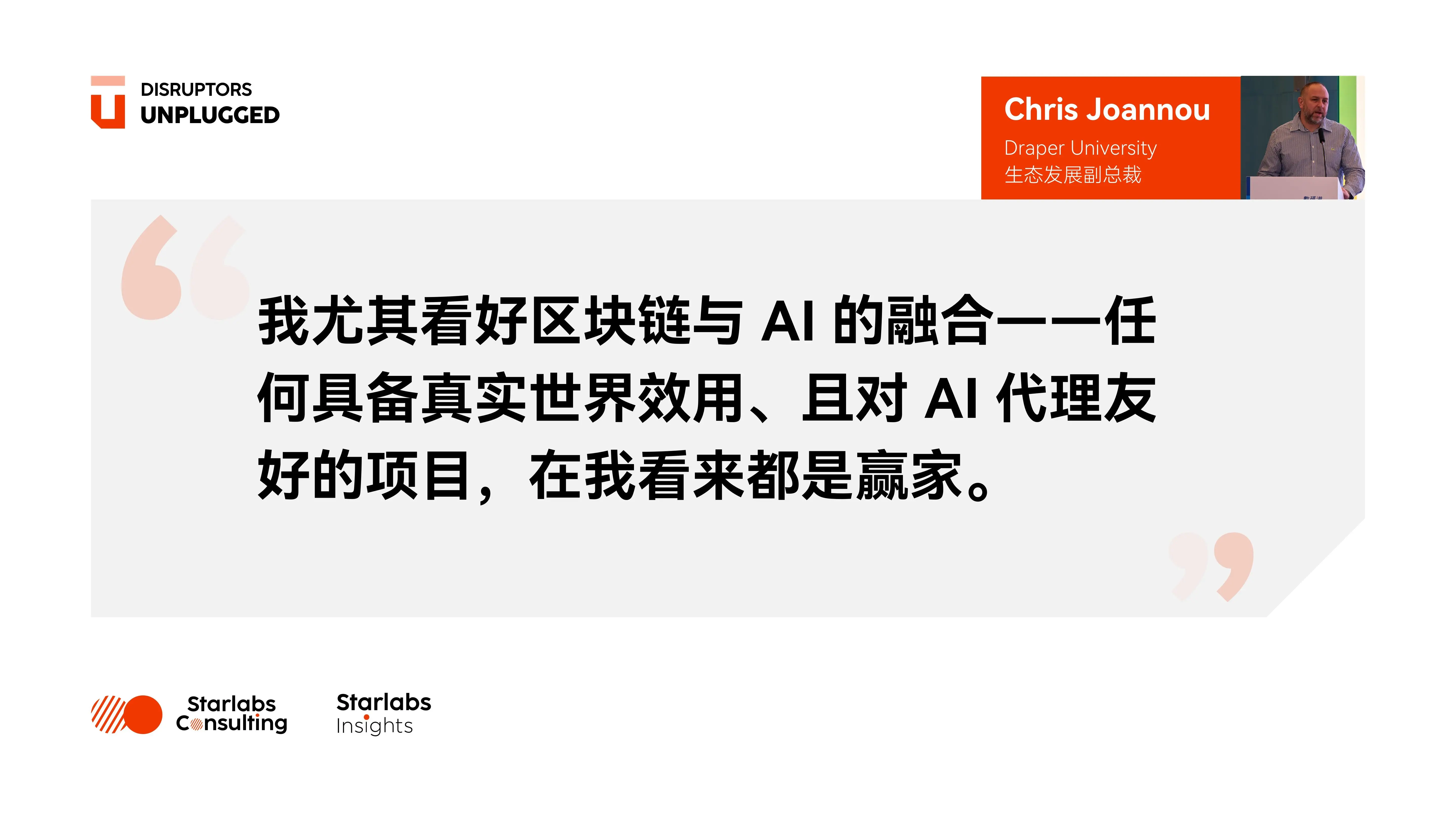Chris Joannou:炒作周期虽是常态,但底层的实用价值正在日趋成熟。我将 Web3 视为下一代互联网不可或缺的「信任层」,也是 AI 天然的经济搭档。随着我们迈向「智能体间商业模式」(agent-to-agent commerce)的时代,我们需要去中心化协议来承载身份认证与支付结算。我尤其看好区块链与 AI 的融合——任何具备真实世界效用、且对 AI 代理友好(agent-friendly)的项目,在我看来都是赢家。