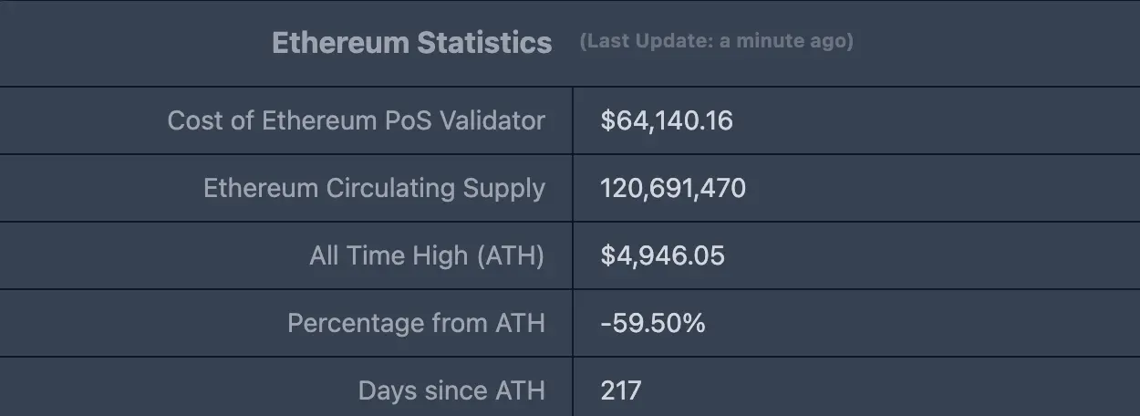 ETHUSD :现价$2,003.94,历史最高价$4,946.05,距最高价跌幅约59.50%