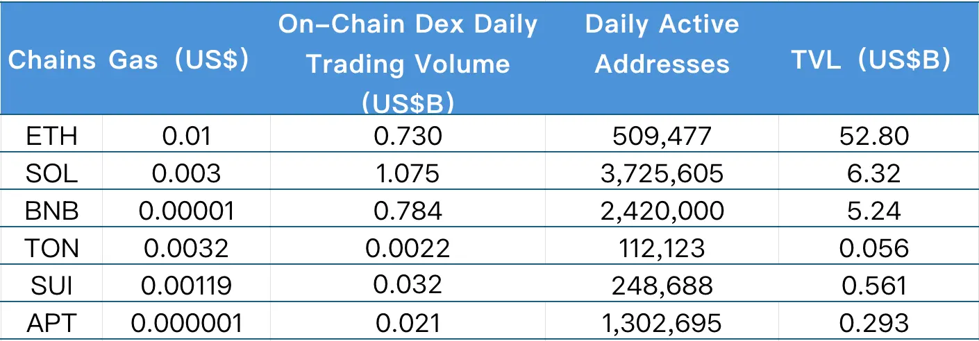 主要从日交易量、日活跃地址、交易费用分析目前主要Layer1含ETH、SOL、BNB、TON、SUI以及APTOS的相关数据。