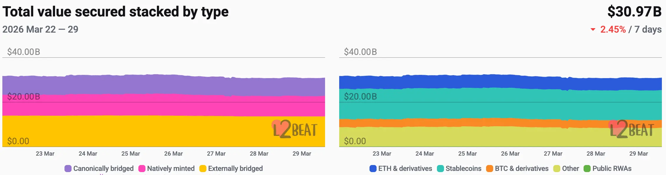 据L2Beat数据显示,本周以太坊Layer2总TVL为$309.7亿,较上周$315.4亿,整体跌幅为1.81%。