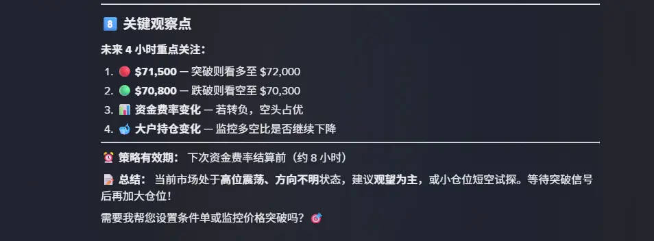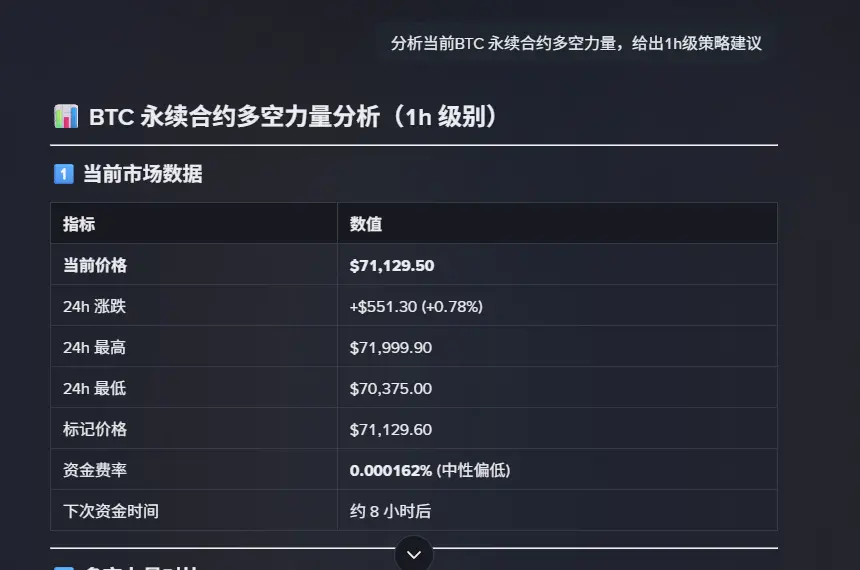 指令测试:“分析当前BTC 永续合约多空力量,给出1h级策略建议。”