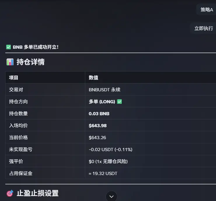 指令测试:“用20USDT 开BNB/USDT 永续1x多单,止盈5%,止损2%。”