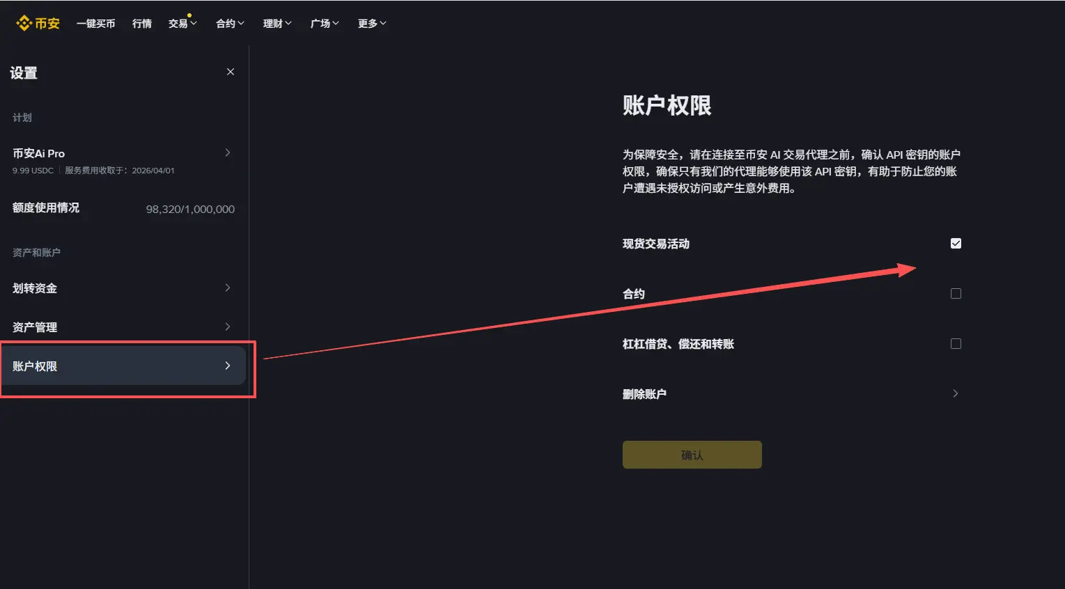 API Key 权限可自行开关(合约/现货/杠杆)。