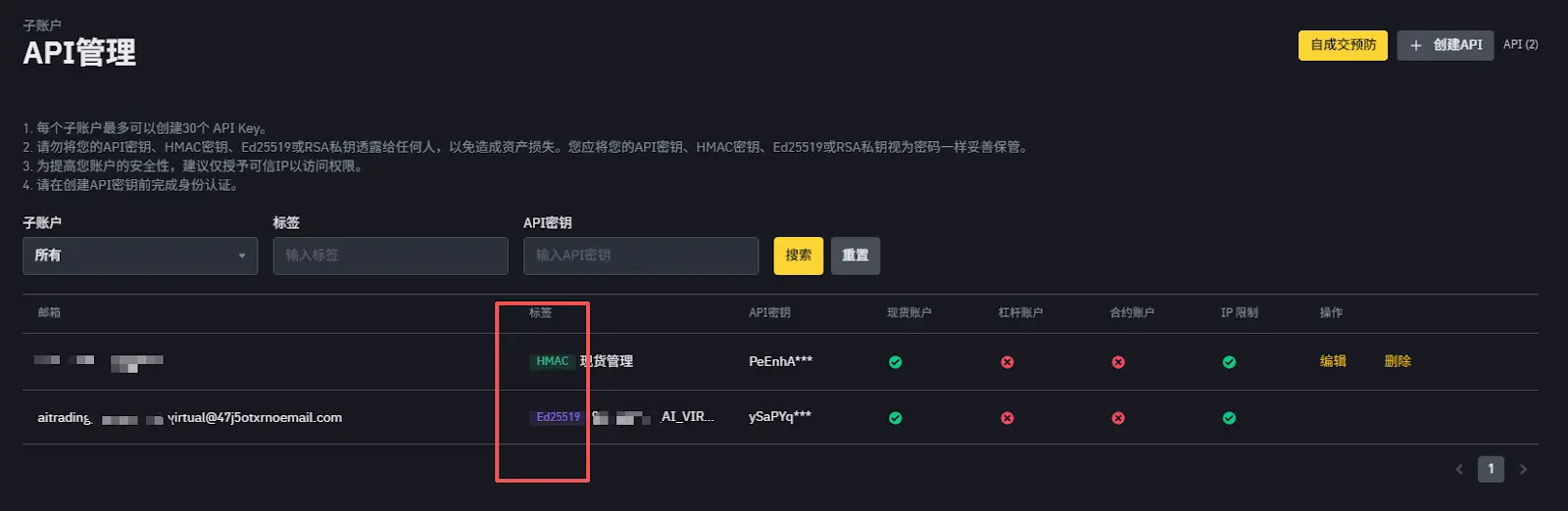 实测小发现:在手动创建 API 时,大多数人习惯了 HMAC 对称加密(API Key Secret Key),这种方式虽然经典,但私钥本质上是由服务器生成并传输的,存在理论上的泄露风险。但小编发现,币安 AI Pro 已经在静默升级安全底座:它会自动为子账户配置 Ed25519 非对称加密算法。