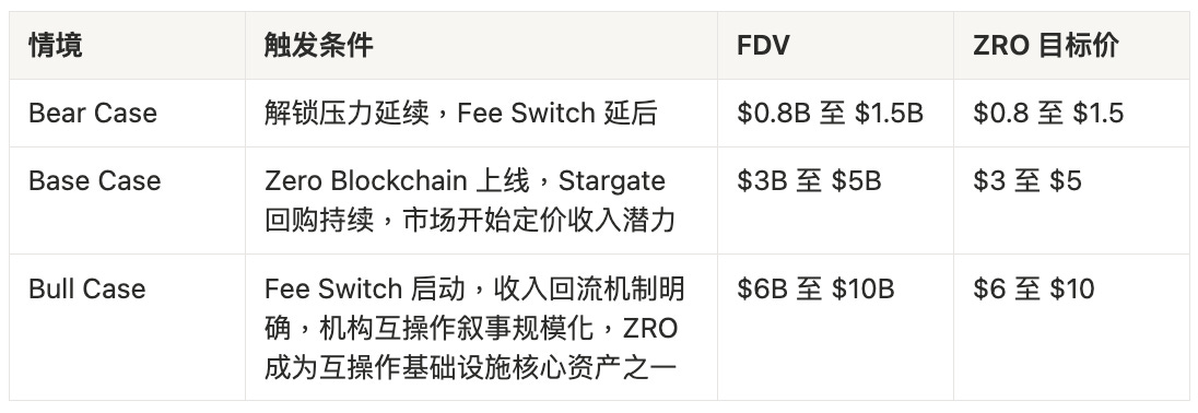 值得注意的是,当前 ZRO 的定价完全基于未来 optionality,而非现有收入。市场目前买入的,是三种期权溢价的叠加:Zero Blockchain 主网上线、Canton 机构管道成熟、以及 Fee Switch 启动后的收入重估。以下情境模型的意义,在于量化「若上述期权兑现」的可能估值区间。