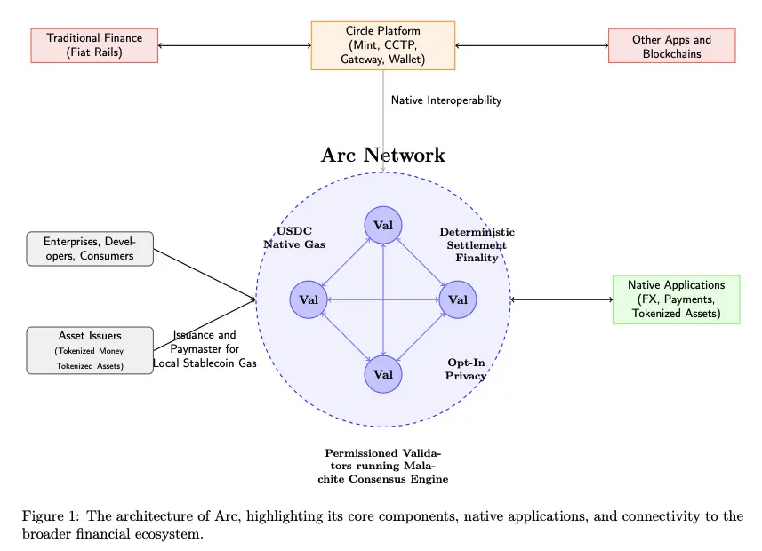 Arc 的核心特征在于:它由一个许可型验证者集合(运行 Malachite BFT 共识引擎)运作,提供确定的最终性;其原生 Gas 费使用 USDC 支付;并提供了一个可选的隐私层。