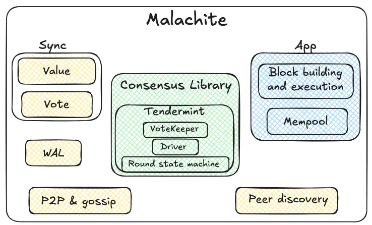 绿色标注的共识库是 Malachite 的核心。其内部的轮次状态机采用 Tendermint 式轮次机制(提议→预投票→预提交→提交)。投票守护器负责聚合投票并追踪法定票数。驱动器随时间推移协调这些轮次,确保即使部分节点延迟或故障时协议仍能持续决策。该共识库具有刻意设计的通用性:以抽象方式处理"数值",使不同类型应用程序均可接入。