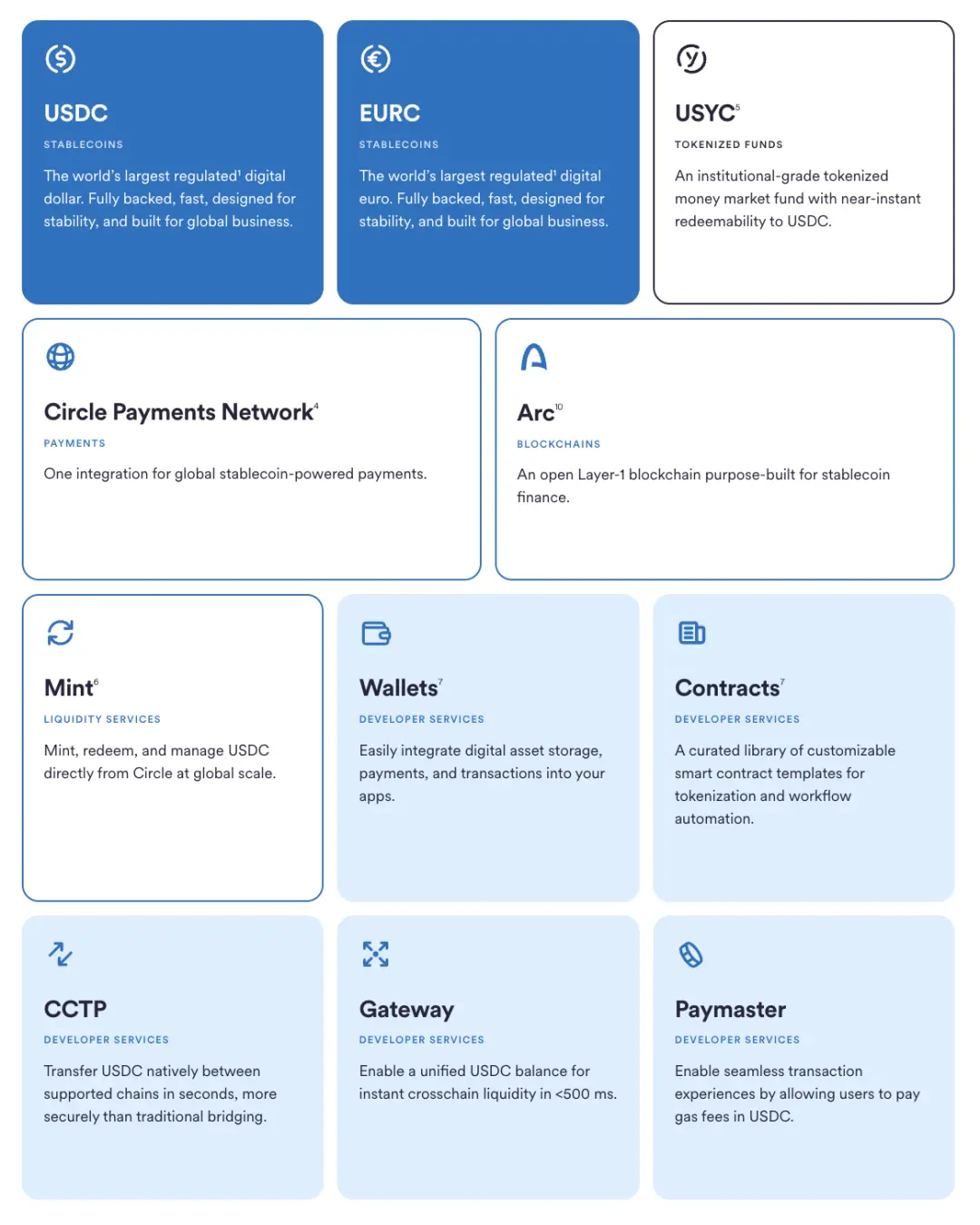 与此同时,Circle 的生态建设一直是审慎且累积式的:它从 USDC 的发行和治理起步,随后通过解散 Centre 并推出可编程钱包来收回控制权。接下来是 CCTP,这将其从依赖跨链桥转变为采用原生的销毁-铸造转移方式,从而统一了跨链的 USDC 流动性。通过推出 Circle Payments Network,Circle 将链上价值与链下商业连接起来。而Arc 则是这盘棋局的最新一步。flank 这些核心支柱的是面向发行方和开发者的服务——Mint、Contracts、Gateway 以及 Paymaster(以 USDC 计价的 Gas 费)——这些服务减少了对第三方的依赖,并 tighten 了产品与分销之间的反馈闭环。