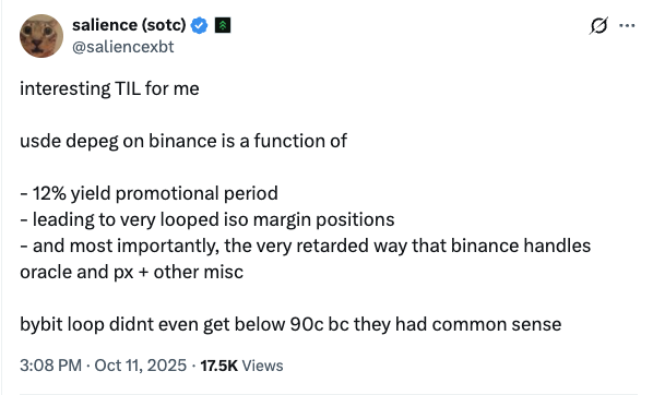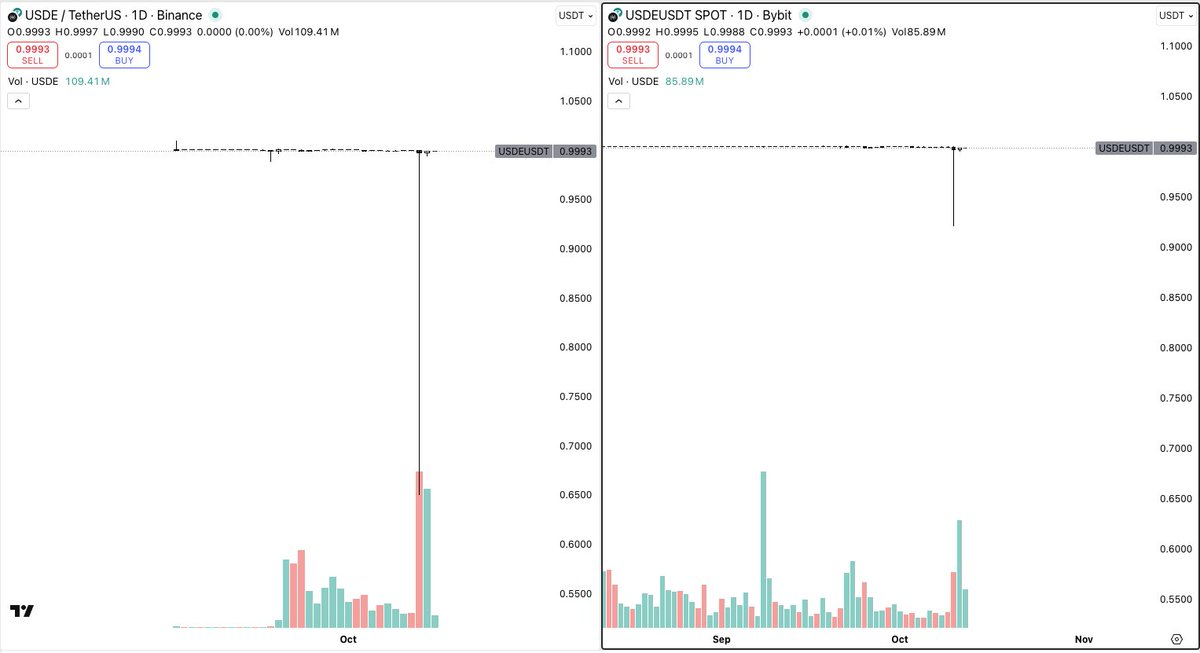 最显著的一点是,在币安平台上,USDe的脱锚比 Bybit 更严重,这给币安用户带来了不少痛苦。