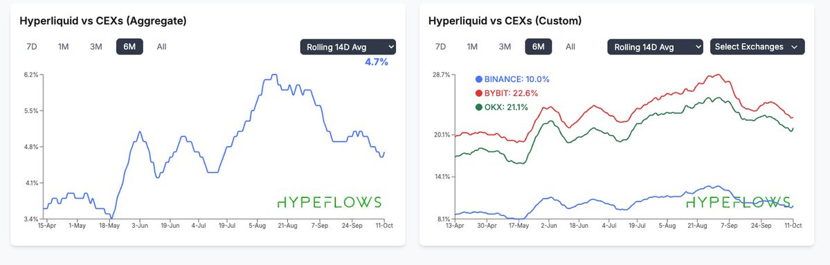 现在回到中心化交易所(CEX)之间的竞争。我的意思是什么呢?首先,我已经解释了永续合约去中心化交易所(Perp DEX)如何在过去一年逐渐失去优势,直到闪崩事件彻底改变了趋势。