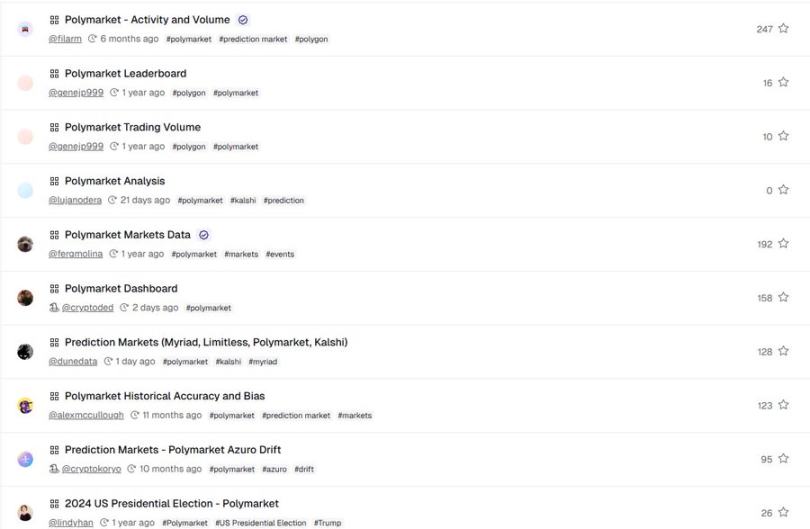 Dune Dashboards:数十个 Polymarket 仪表板,一些是全局性的(交易量、用户、交易),其他是专业性的(内部人士、空投追踪器、巨鲸等)。