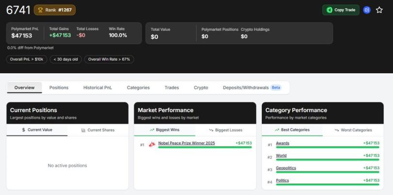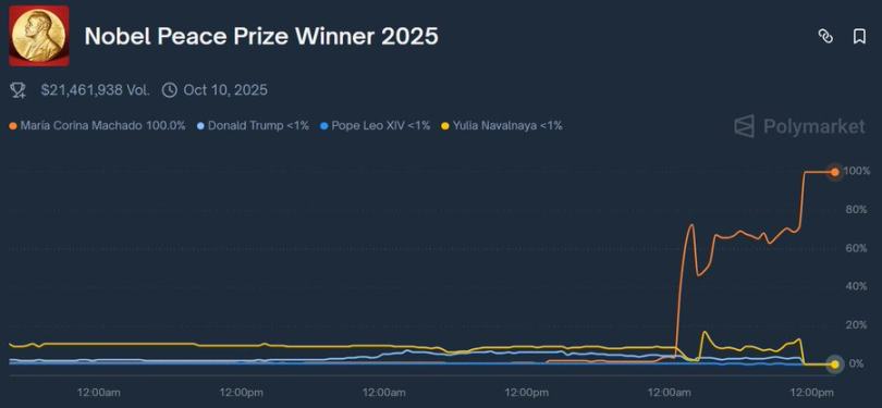 在诺贝尔奖市场中,负责评选诺贝尔奖得主的委员会显然比其他任何人都更早知道结果,他们中的一些人可能会悄悄利用这些信息在 Polymarket 上进行交易。