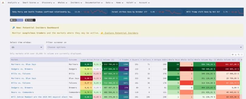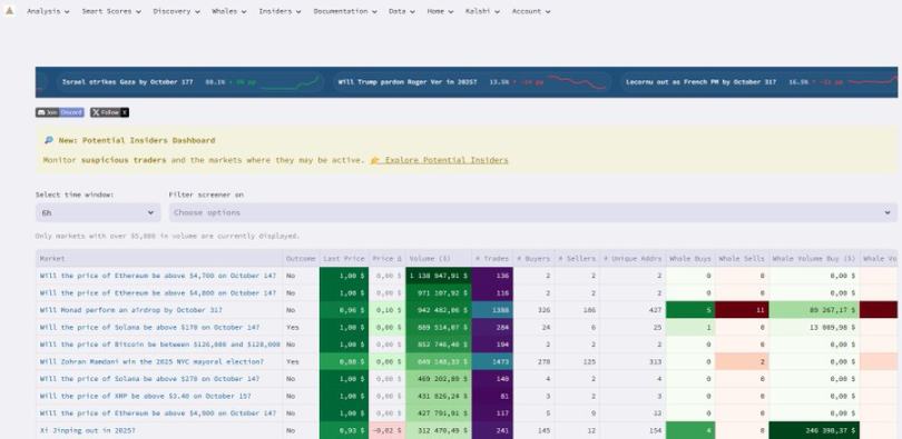 Hashdive(dot)com:另一个强大的分析平台。每个市场页面都包含深度指标,以及一个新的「内部人士」部分,可帮助你识别潜在的内幕交易者。