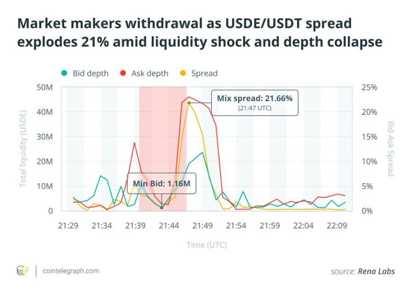一些交易者利用这个缺陷,抛售了 6000 万 到 9000 万美元的 USDe,将局部价格打压至 0.65 美元,并触发了 5 亿 到 10 亿美元的强制清算,因为这些资产被用作保证金。