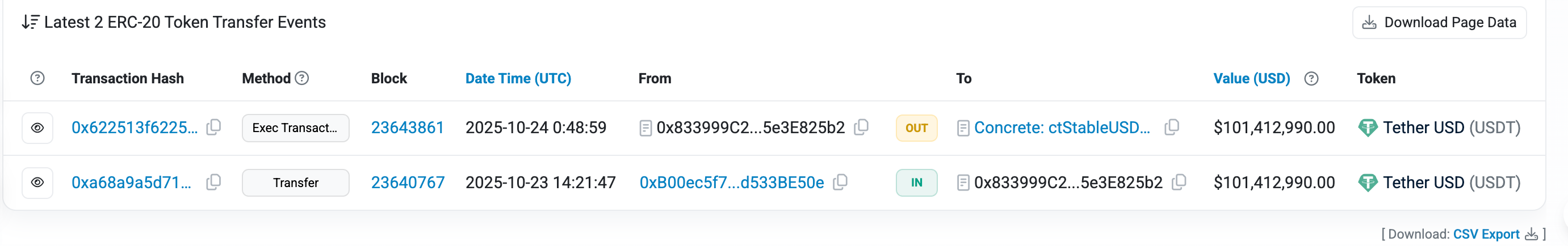10月24日 8:48:47 :第一笔大额存款5,000万USDT进入存款 Vault