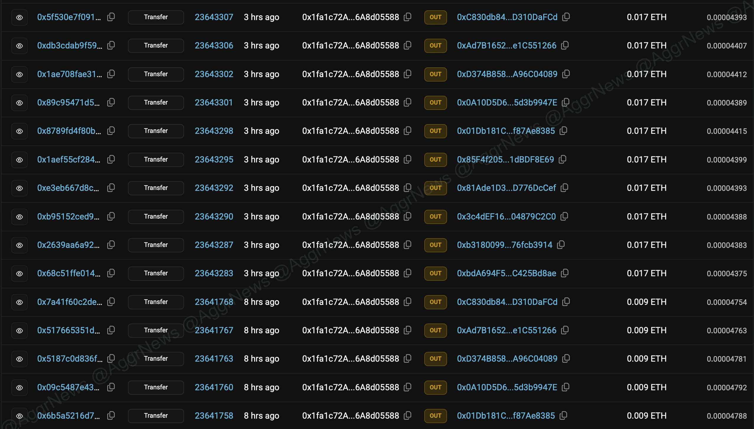 10月24日,部署狙击矩阵。 同一个 0x1fa1c... 地址突然活跃,向 10个独立地址每个精准分发 0.017 ETH 作为 Gas 费。这10个地址此前毫无交集,更像是为存款活动专门准备的"马甲"。