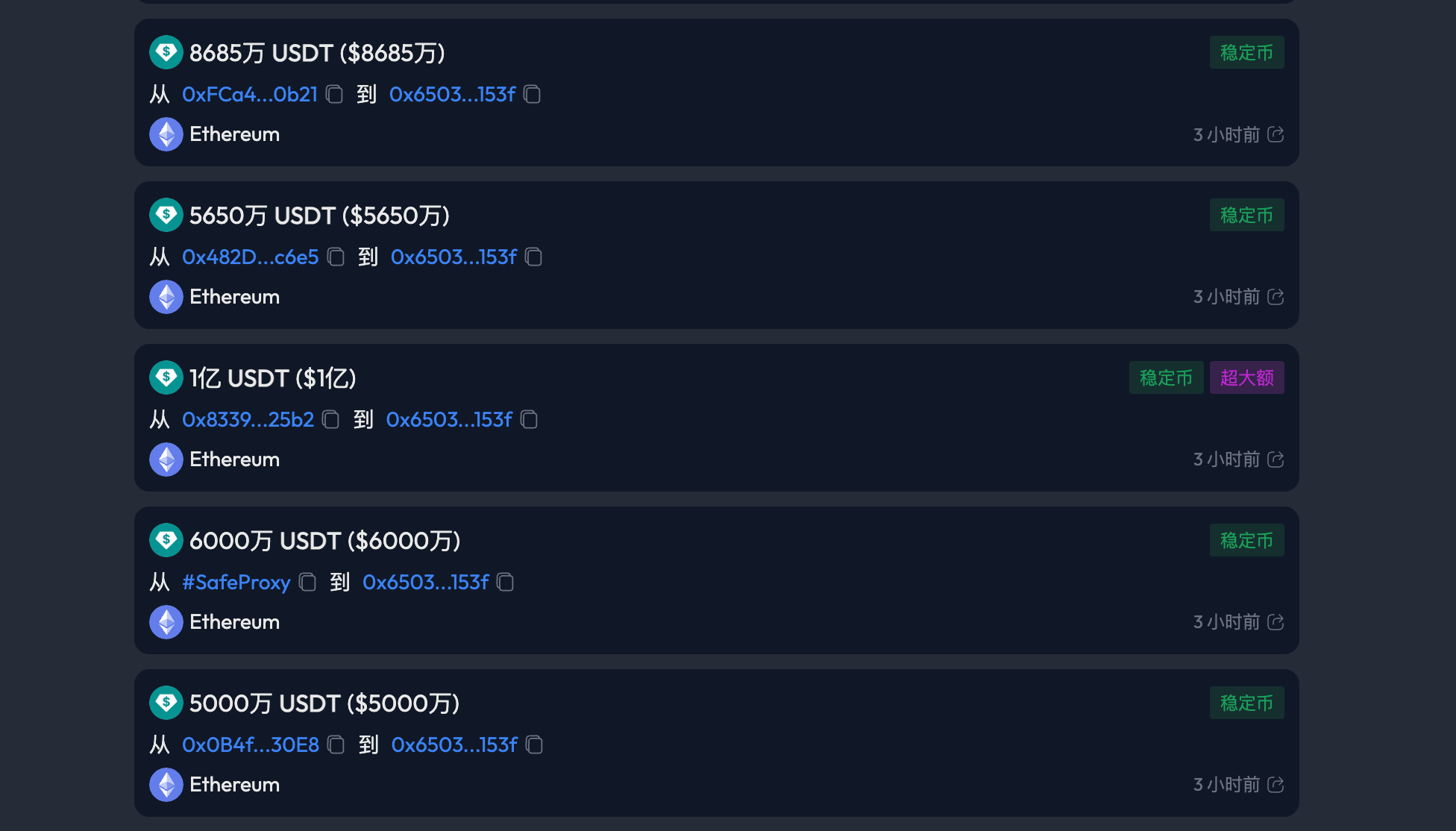 几乎在同时多个其他的地址,也向这个1亿美金的转入地址进行转账,且金额都在5000万级以上。此时,如果你恰好是一个投研驱动的人且习惯设置各类预警,那么就应该嗅到了异常。