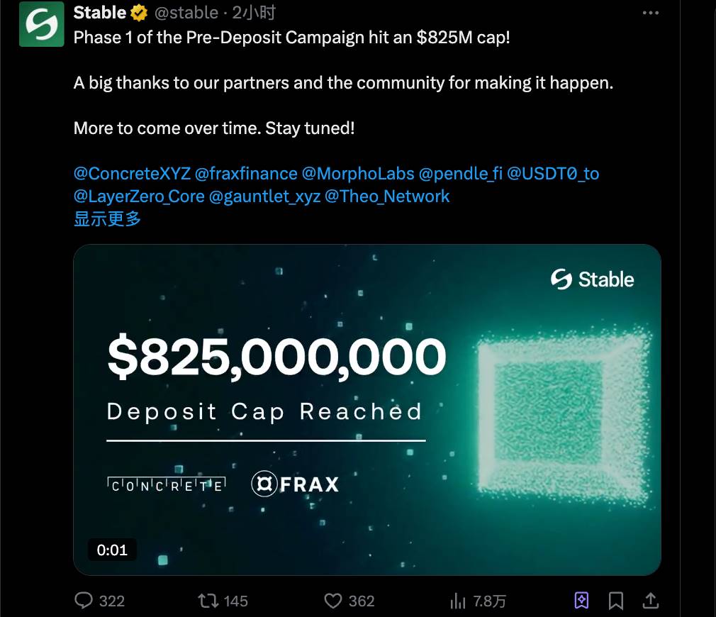 上午9:13分,稳定币公链项目 Stable 官方Twitter发出预存款活动公告。8.25亿美元的额度在极短的时间内就已经售罄,看上去活动极其火爆和成功。