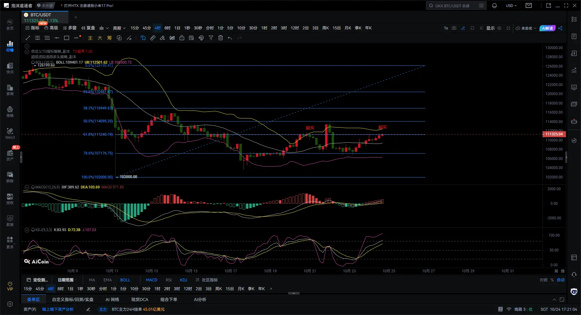 价格当前正处于斐波那契61.8%回撤位附近震荡,这是技术分析中的关键转折区域。如果能有效突破并站稳111500上方,则表明回调结束、趋势转多。如果多次受阻并跌破中轨,则可能重新测试107000支撑,甚至下探102000的底部支撑。因此,111200附近成为决定后续趋势方向的关键点位,需要密切关注该位置的突破情况。
