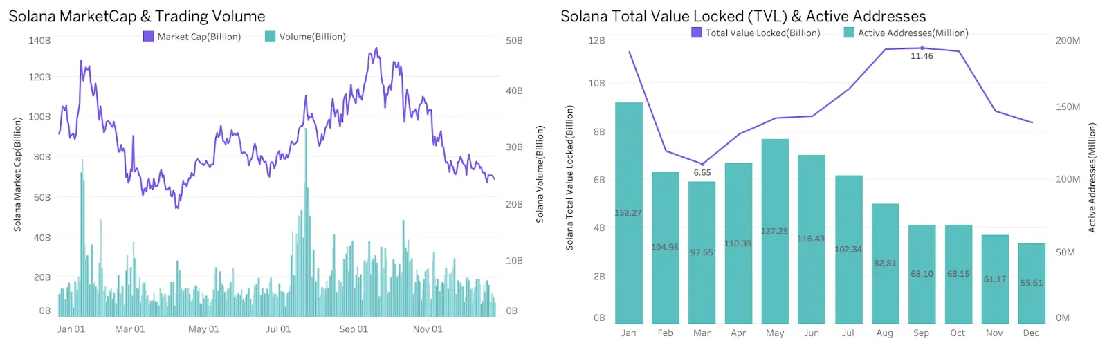 链上数据层面,比特币市值在上半年随行情快速扩张并维持高位,三季度高位震荡,四季度受系统性风险冲击明显回落,显示价格中枢抬升的同时波动显著加大。交易量主要集中在趋势拐点和剧烈波动阶段,尤其在快速下跌时放量突出,体现出比特币作为加密市场核心流动性载体的地位。