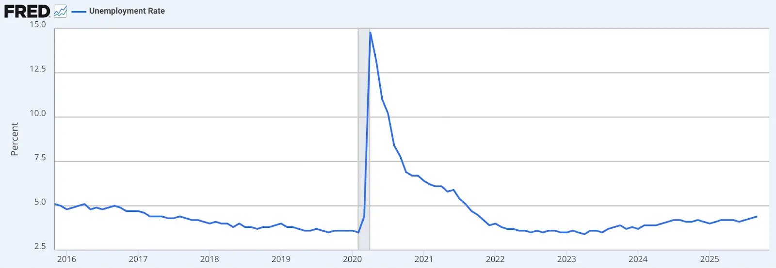 与通胀的缓慢退坡相比,劳动力市场在2025年下半年释放了更为明确的转弱信号。失业率已由年初的低位平稳攀升至4.6%,触及2021年以来的最高阈值,标志着后疫情时代劳动力严重供不应求的紧张状态已实质性缓解。尽管非农数据维持正向增长,但内部结构已严重分化,对利率敏感的制造业与金融业招聘动能几近停滞。就业端的防御性压力正取代抗通胀需求,成为驱动美联储在年底开启阶梯式降息的决定性边际变量。