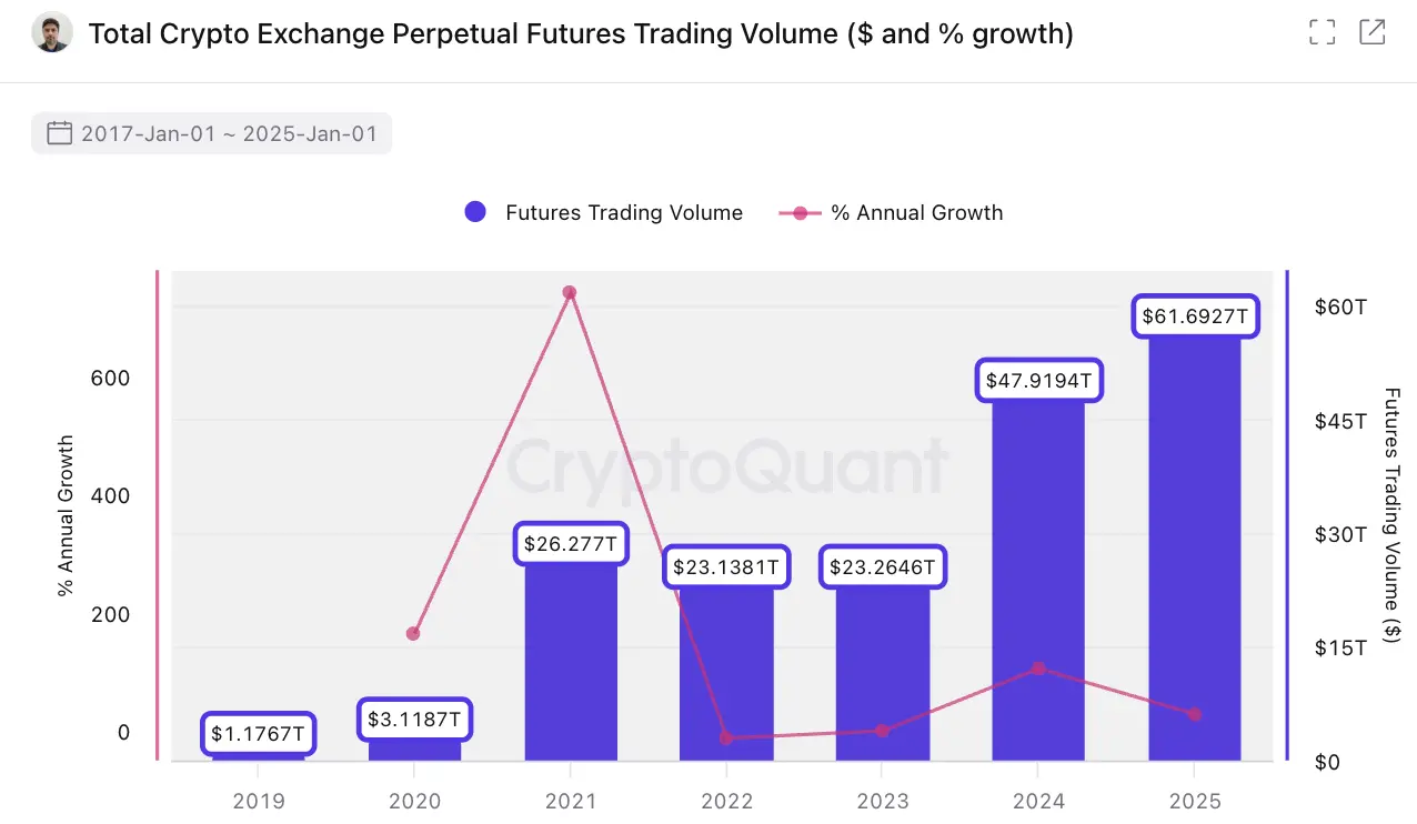 这一点,可以从加密市场的经验中获得参考。过去几年中,永续合约已经成为加密衍生品市场最核心的交易结构之一。根据 CryptoQuant 数据,2025 年全球加密市场的总体交易规模接近 79 万亿美元。其中,永续合约交易量约为 61.7 万亿美元,而现货交易量约为 18.6 万亿美元。从结构上看,永续合约已成为加密市场中占据主导地位的交易形式,其交易规模约为现货市场的 3.3 倍。进一步来看,2025 年永续合约交易量达到约 61.7 万亿美元,创下历史新高,较 2024 年的 47.9 万亿美元增长约 28.7%。同时,自 2019 年以来,永续合约交易量始终保持稳定的上升趋势,反映出市场对这一衍生品交易结构的长期偏好与不断增强的参与度。这也说明,只要资产具备足够的流动性和价格波动,市场对“永续化”的交易形式本身是高度接受的。