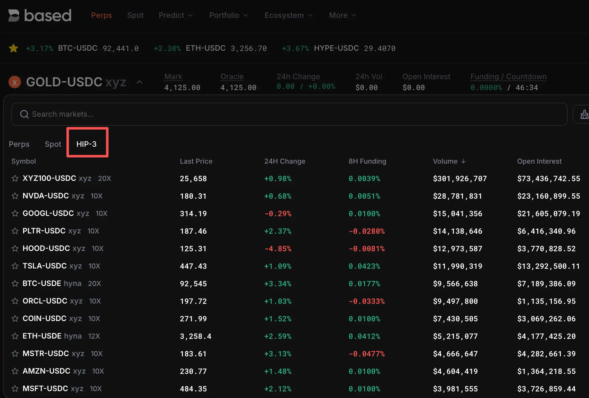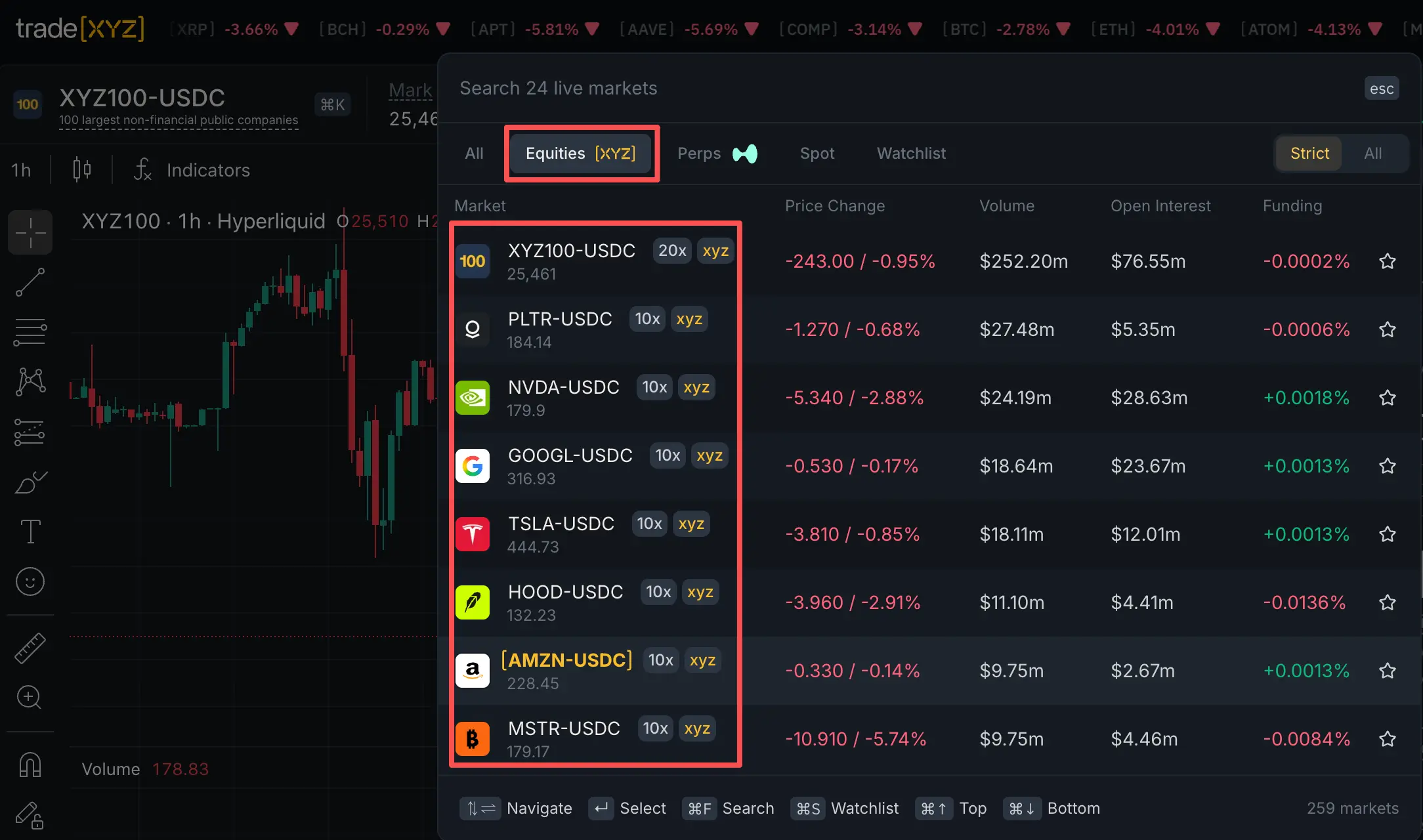 综合指数永续合约XYZ100,24小时交易量可达3亿美元。单股资产24h交易量约在百万美金~千万美金级别 |