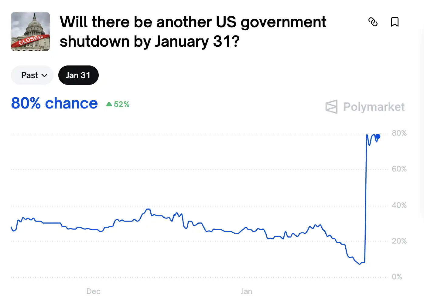 目前在 Polymarket 上关于「美国政府是否会在 1 月 31 日前再次关门?」的概率已经暴增到了 80%。