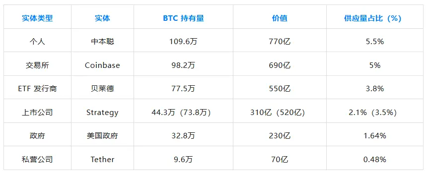 以下是来自各个主要实体类别(个人、交易所、ETF 发行商、政府机构、上市公司和私营公司)的顶级比特币持有者。