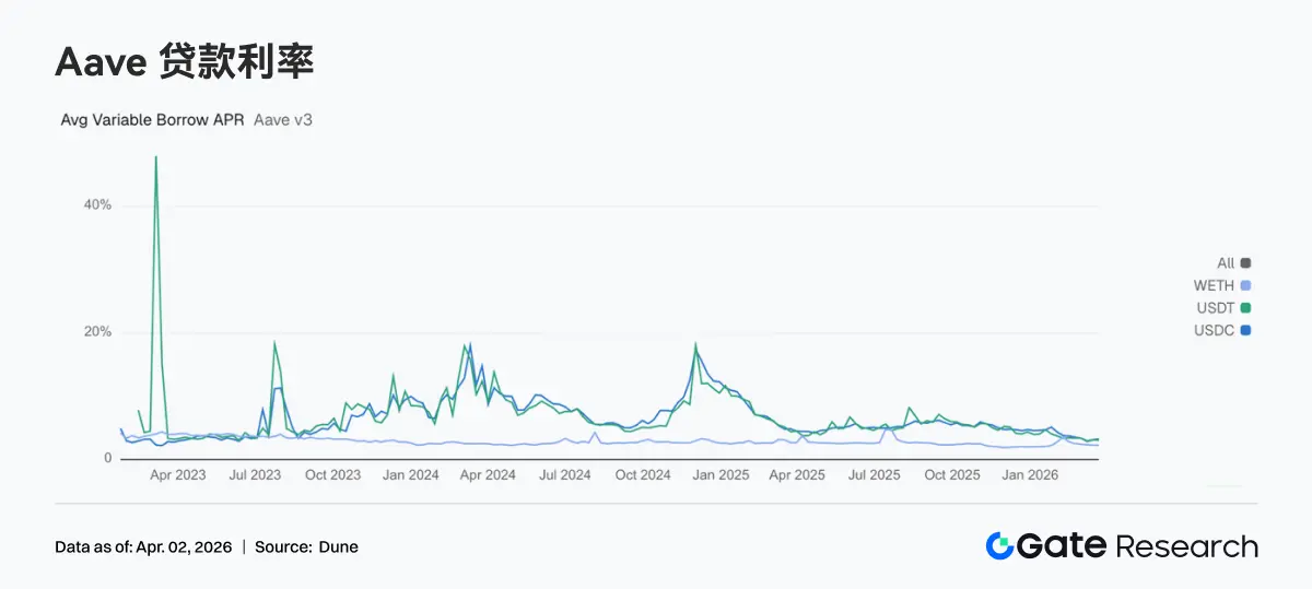 USDC 平均浮动借款 APR 从 3.10% 升至 3.23%,本周美元稳定币需求并没有随着总贷款余额回落而同步走弱。与之相对,USDT 从 3.10% 回落至 3.02%,WETH 也从 2.25% 小幅降至 2.23%。本周链上资金在压缩广义风险敞口的同时,把借贷需求更集中地留在 USDC 上。若从策略视角看,这通常对应机构更偏好用 USDC 做流动性调度、抵押品管理和中性策略周转。结合 Aave 最新治理进展,V4 的风险隔离与流动性路由框架正在逐步清晰,未来不同资产之间的利率分化大概率会更频繁,也更能反映真实的资金偏好。