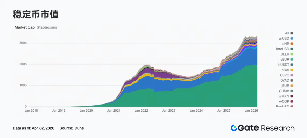 本周稳定币板块没有出现新的外部增量,整体高位盘整。USDT 与前一周几乎持平。USDC 回落约 14 亿美元,PYUSD 也下滑近 2 亿美元,这支付和结算导向的稳定币需求本周略有回落。相对更稳的是协议型稳定币,DAI 小幅增长,USDS 维持高位。USD1、USDe、GHO 有小幅波动,偏向结构性再配置。Circle 近期仍在推进 USDC CCTP 的多链扩展,但本周数据反映是稳定币内部从支付结算向DeFi 场景韧性倾斜。