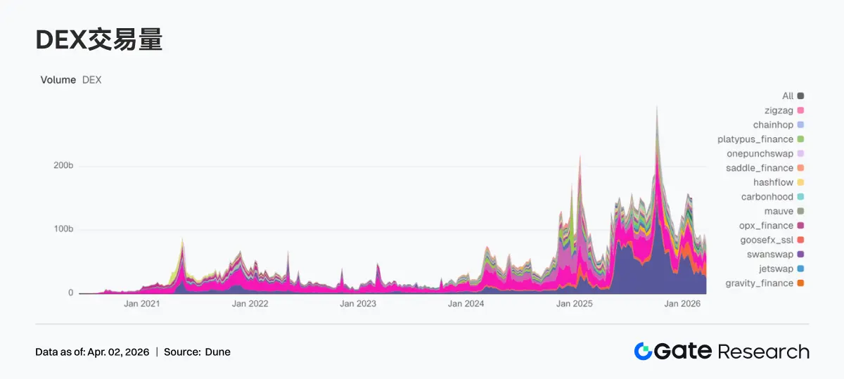 交易热度从上周的冲高切回降温阶段,头部协议普遍回落。PancakeSwap 和 Uniswap 周交易量均较上周回落,主流链上的现货交易需求整体收敛。Solana 侧则出现分化,Meteora 仍维持在略高于 200 亿美元交易量的高位,但边际增量已经放缓;Raydium 周交易量环比下滑 50%,创下头部 DEX 最大降幅。Aerodrome、Humidifi、Bisonfi 也都出现不同程度回落。结合协议侧情况看,PancakeSwap 的 Infinity 架构和 Meteora 的 DLMM 仍然是最强的效率标签,但本周市场更重视确定性流动性。